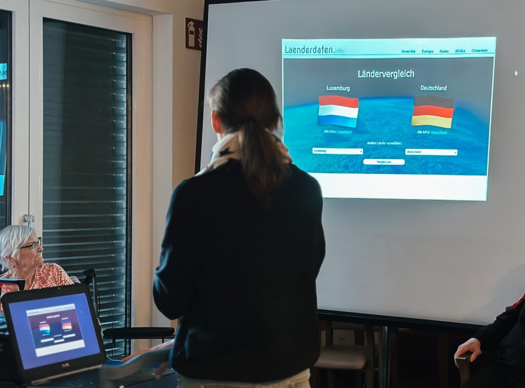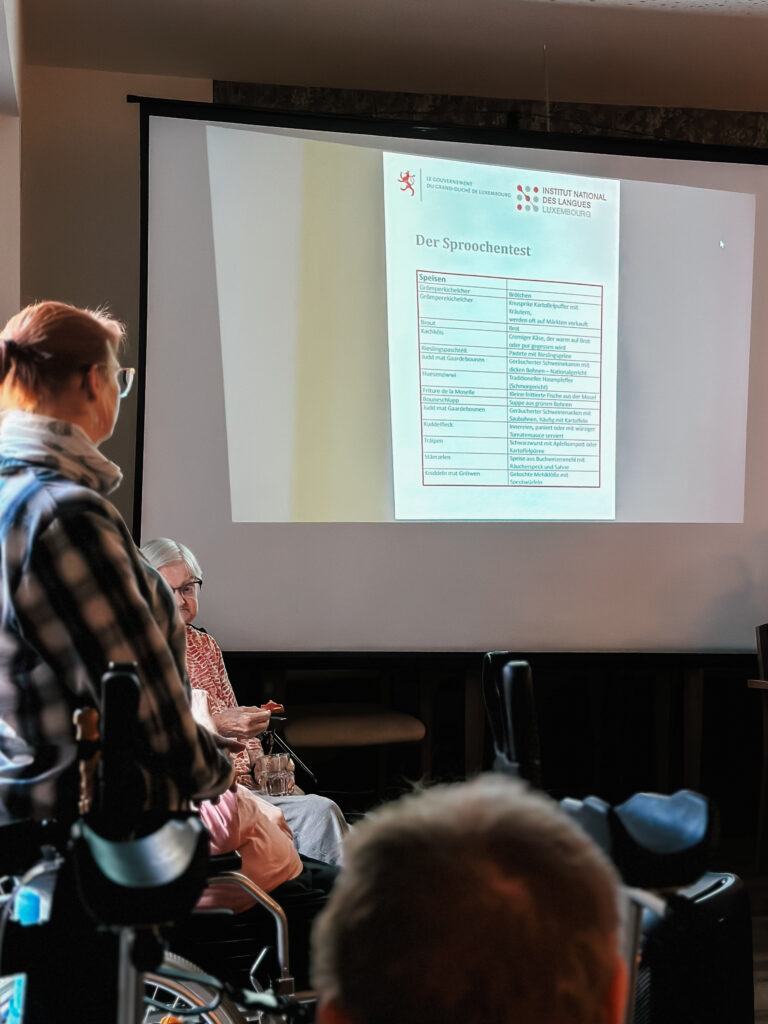 Somit nutzten wir die Versammlung, um die Senioren und Seniorinnen darüber zu informieren, auf den sogenannten Sproochentest für die Einbürgerung vorzubereiten und die luxemburgische Hymne zu üben.