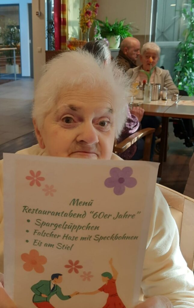 Die 60er Jahre sind unseren Bewohner*innen als ein ereignisreiches Jahrzehnt im Gedächtnis geblieben. Viele der Senior*innen standen zu diesem Zeitpunkt mitten im Leben mit Familie, Beruf usw. Erinnerungen wurden lachend bei einem Glas Ananas-Bowle ausgetauscht. Ein leckeres Menü rundete den Abend ab bestehend aus einer Spargelcremesuppe, Hackbraten mit Speckbohnen und Eis am Stiel zum Nachtisch.