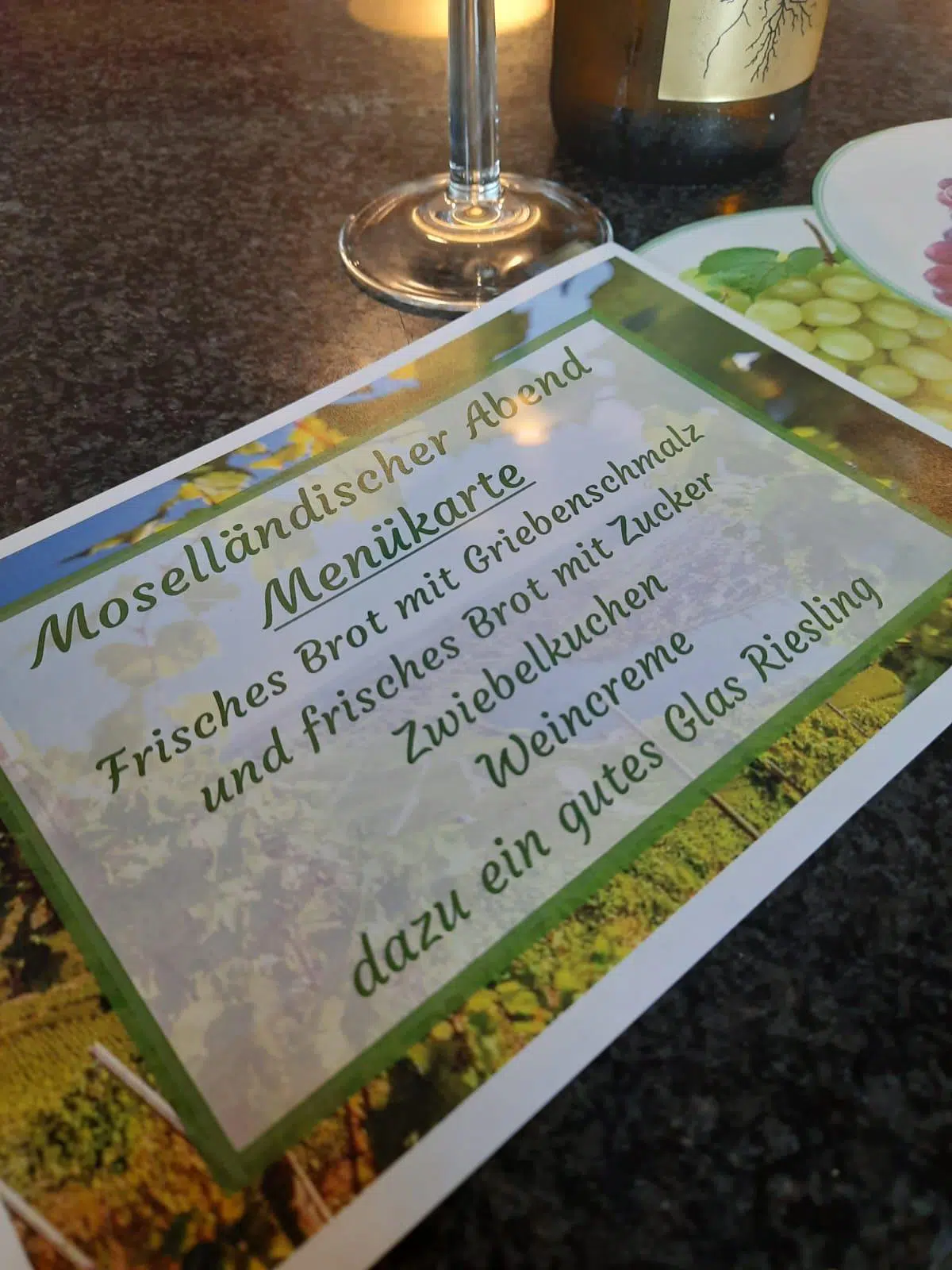Wenn der Spätsommer sich so langsam verabschiedet und der Herbst bereits an die Tür klopft, ist es Zeit für herzhaften Zwiebelkuchen mit einem Glas Riesling. Grund genug für unseren letzten Restaurantabend in diesem Jahr uns der heimischen Region zu widmen. So erweiterten wir die typisch moselländische Menüfolge mit Brothäppchen mit Butter und Zucker sowie Griebenschmalz und als Nachtisch selbstgemachter Weincreme. Für unsere Bewohner*innen war dies das absolute Highlight!