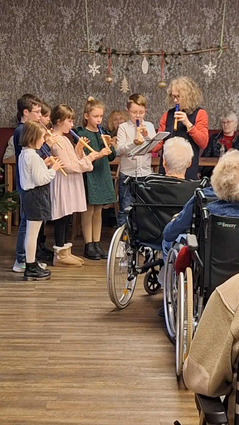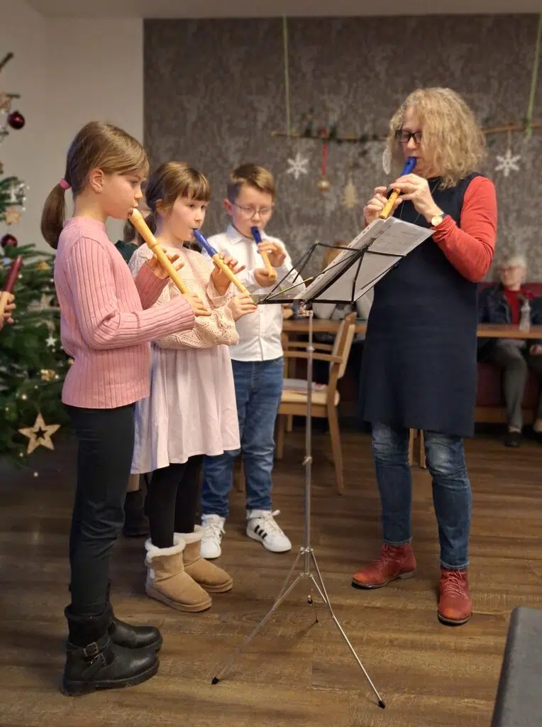 Heute besuchten uns die Schüler*innen der Kreismusikschule Wittlich aus den Gruppen Altrich und Wengerohr. Gemeinsam mit ihrer Flötenlehrerin Frau Sch. spielten sie für unsere Bewohner*innen bekannte Weihnachtslieder. Die Senioren und Seniorinnen waren so gerührt, dass sie fast den Atem anhielten, um die Kinder in ihrer Konzentration durch Geräusche nicht zu stören. Dafür fiel der Applaus umso lauter aus.