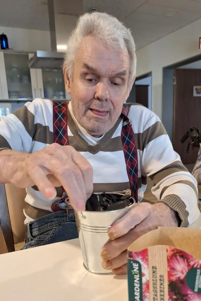 Und so nutzten wir den heutigen Pflanze-eine-Blume-Tag, um uns auf den ersehnten Frühlingsanfang vorzubereiten. Auf jedem Wohnbereich wurden verschiedene Blumensamen unter fachmännischen Anweisungen ausgesät, denn viele unserer Bewohner*innen betrieben früher selbst einen eigenen Nutz-oder Ziergarten, in dem sie viele Stunden verbrachten. So blieb auch der Gesprächsstoff nicht aus und es wurden viele Erinnerungen erzählt, Expertenwissen diskutiert und Tipps und Tricks weitergegeben. Wir sind sehr auf das Ergebnis gespannt!