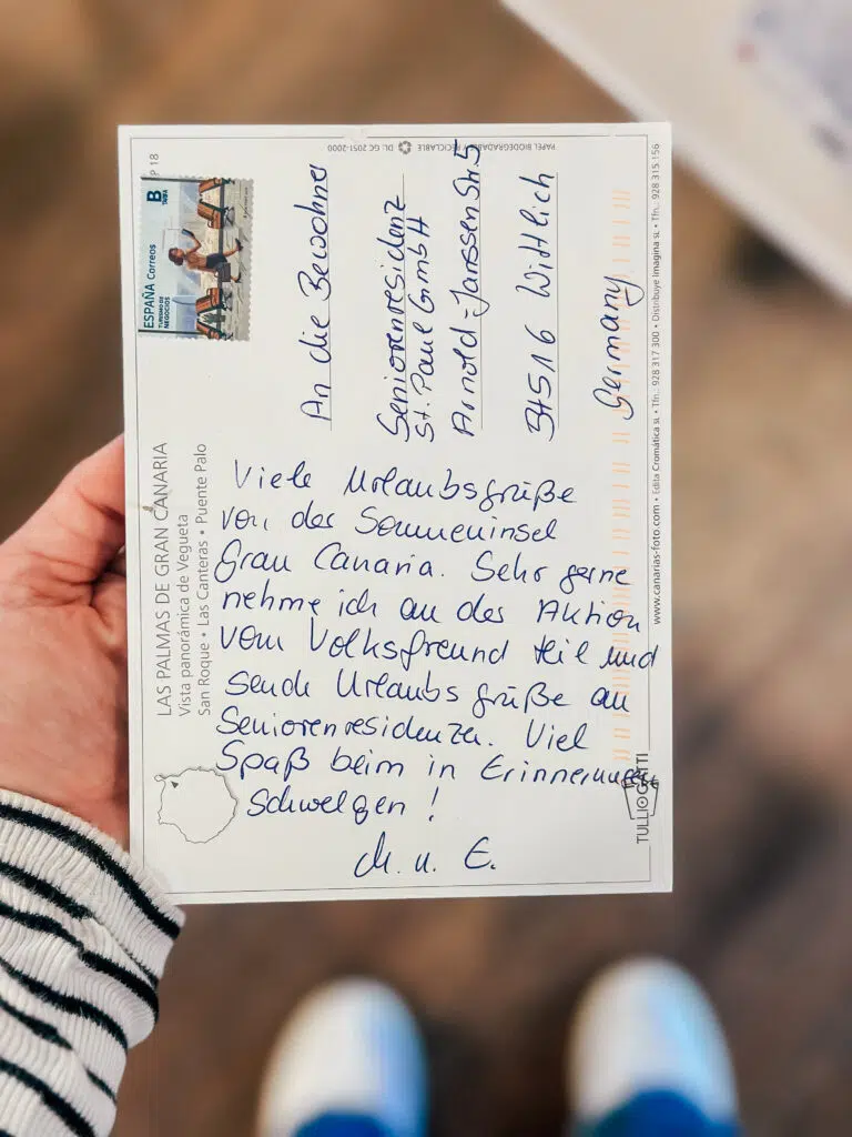 Unter den rund 50 eingegangenen Karten befanden sich viele Urlaubsgrüße aus allerlei fernen Ländern. Manch einer schickte aber auch Post aus der Nachbarschaft, um mit netten Worten unseren Bewohner*innen eine Freude zu bereiten.