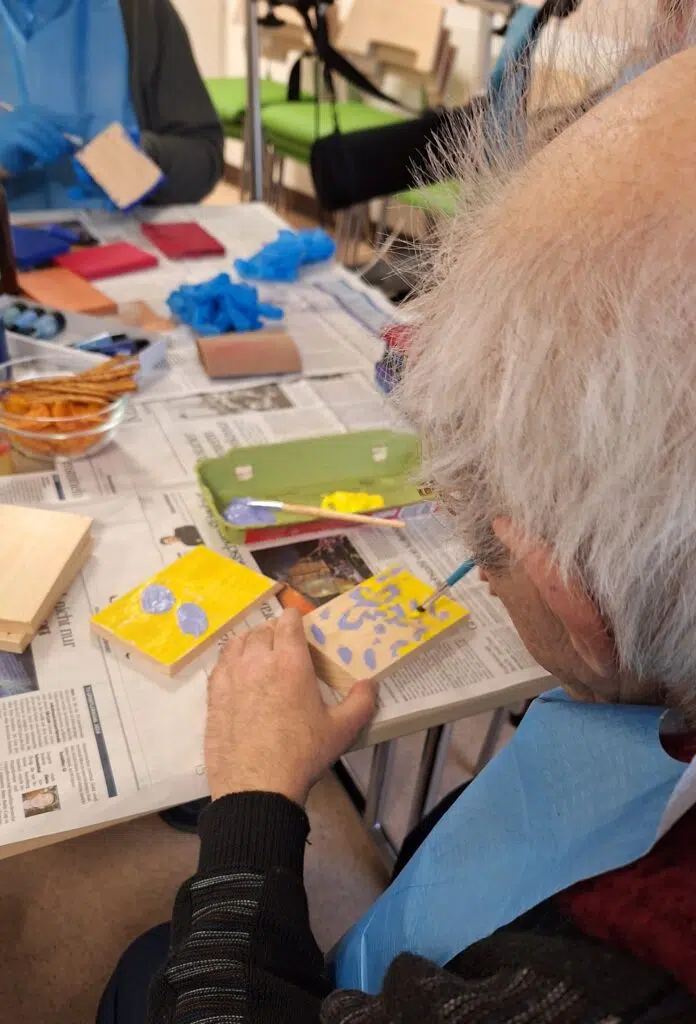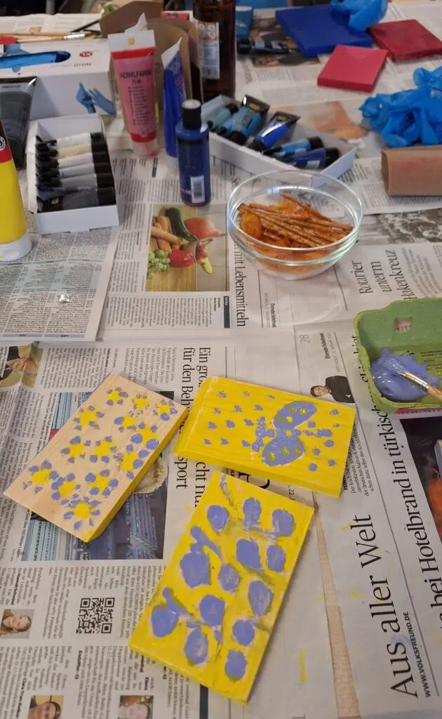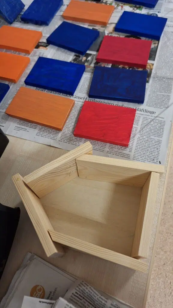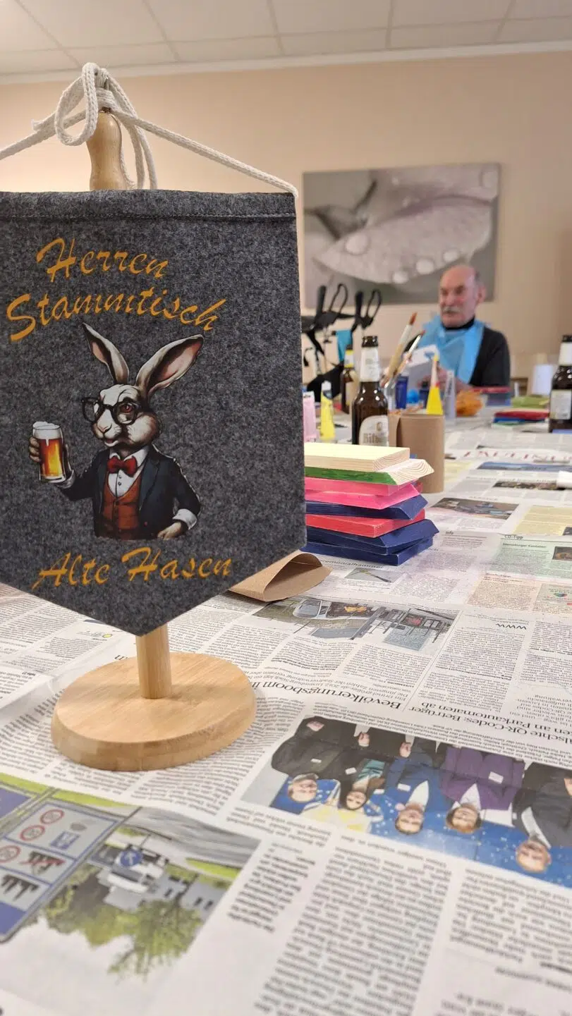 Unsere Herren sind wirklich fleißig! An unserem Herrenstammtisch werkelten unsere Bewohner emsig. Zunächst musste Holz zugeschnitten und bunt angestrichen werden. Demnächst werden die Holzplatten zusammengefügt.