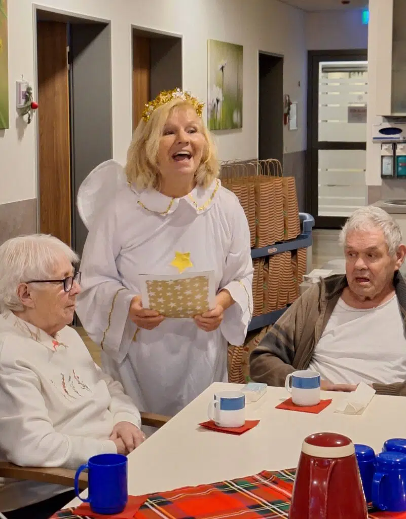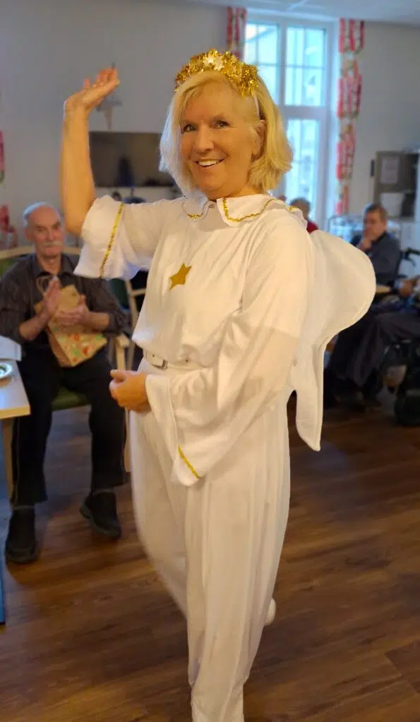 An Heiligabend besuchte nachmittags noch das Christkind unsere Bewohner*innen und verteilte Weihnachtsgeschenke. Die Freude auf Seiten der Bewohner*innen über diese wertschätzende Geste war groß. Gemeinsam wurde im Anschluss ein Weihnachtslied gesungen, dann musste das Christkind sich schon verabschieden, denn es hatte noch viele Besuche vor sich.