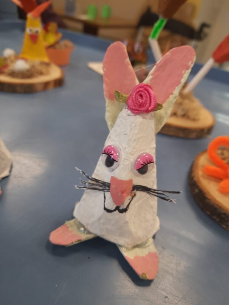 Unsere Frühlingsboten sind ganz einfach in der Herstellung. Die Figuren werden aus Eierkarton zugeschnitten, mit Acrylfarbe angemalt und je nach Figur mit Mund, Nase und Augen versehen.