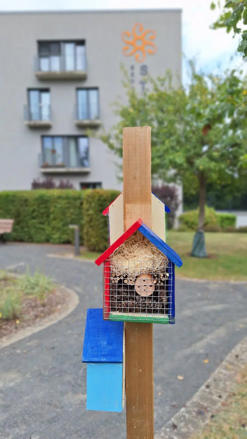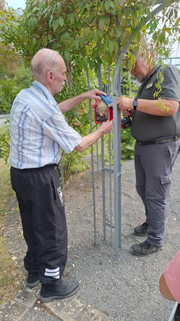 Unser Projekt ist endlich fertig! 10 selbstgebaute Insektenhotels fanden heute ihren Platz in unseren Gärten. Über Monate haben unsere Bewohner vom Herrenstammtisch die Häuser geschliffen, bemalt, genagelt, geleimt und befüllt. Zur Feier des Tages wurde heute beim Herrenstammtisch gegrillt und Pläne für das nächste Projekt geschmiedet