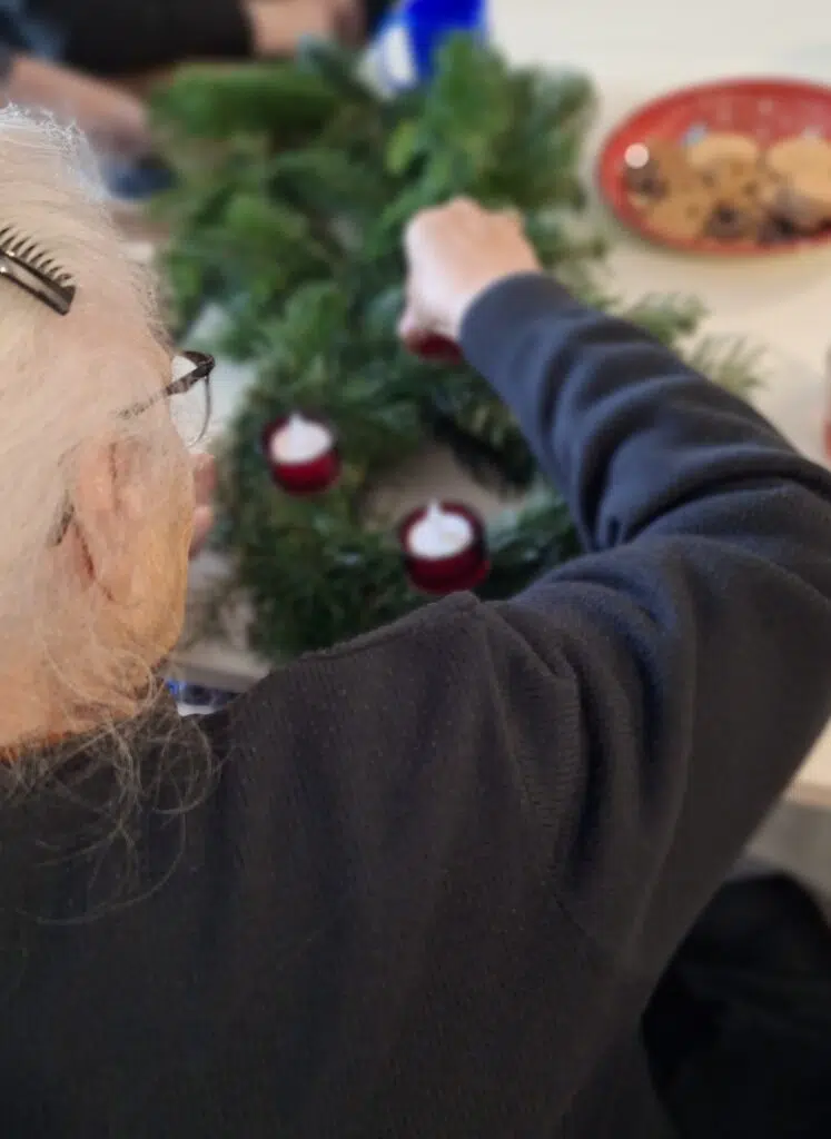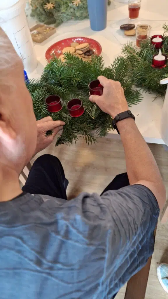 Zum Auftakt der Weihnachtszeit basteln wir in jedem Jahr gemeinsam mit unseren Bewohner*innen vor dem ersten Advent für jeden Wohnbereich einen eigenen Adventskranz in gemütlicher Runde. Hier kann und darf jeder nach seinen Fähigkeiten und seiner Motivation mitwirken. Daher sehen unsere Kränze nicht immer so akkurat und symmetrisch aus wie die, die man käuflich erwerben kann. Dafür aber sind unsere Adventskränze mit Herz und Freude auf die bevorstehende Zeit entstanden.