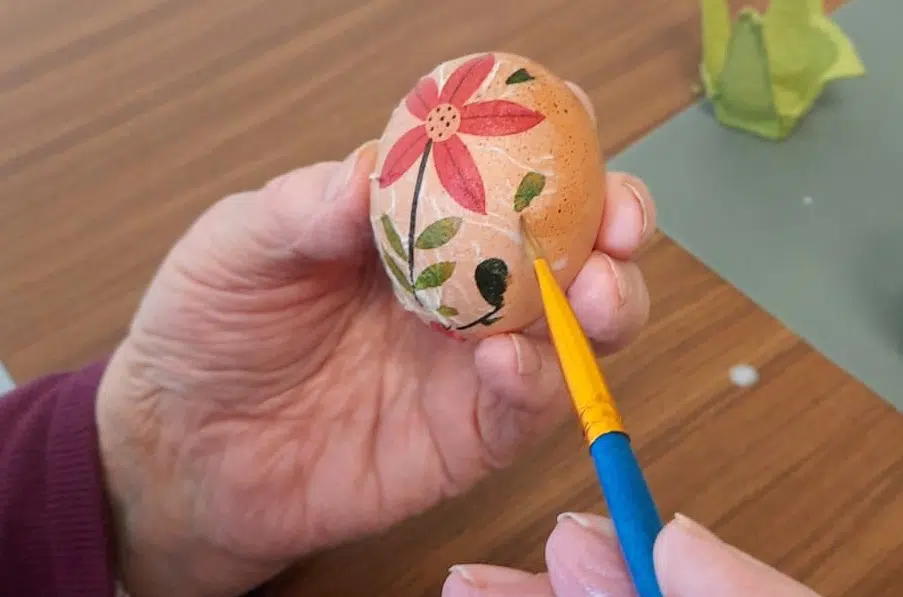 04.04.2026 - Vorbereitungen für Ostern In der letzten Woche haben wir uns schon auf das Osterfest vorbereitet und fleißig Eier bemalt und gefärbt. Auch die Serviettentechnik lässt sich hier einfach anwenden: die bedruckte Schicht einer Serviette auf ein hart gekochtes Ei auflegen und mit Milch von innen nach außen vorsichtig bestreichen. trocknen lassen, fertig!